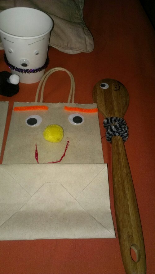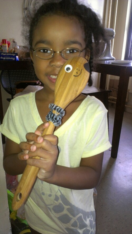 My daughter gets a monthly subscription from CHIRP magazine designed for kids according to ages. I won this subscription for her courtesy of a Twitter party last year and she’s been enjoying every issue. What I love about this magazine is the fun activities that we can do as a family. In the new issue she just received there was a craft section on making Silly Spoons. You needed to have wooden spoons, fabric, glue, markers, stickers, etc., etc. My daughter immediately wanted to do this project so we went to Target to buy everything she needed. We decided instead of buying a bunch of wooden spoons we would purchase one to see how it went, and use other items we already had in the house to make different types of silly faces. Target had exactly what we needed all in one bag for $4.99. It came with 48 fuzzy sticks, 16 glitter poms, 126 poms, 20 glitter sticks, 40 wiggly eyes, and 10 wild animal fuzzy sticks. I have a picture of the package below. I also purchased glue, markers, and crayons. We had paper cups, paper bags, and plates already at home. I can honestly say we had a fun Sunday morning just inventing different faces with simple items from home and with the great package we purchased. Everyone enjoyed her art and my mother said she should sell them. My son even made a few.
