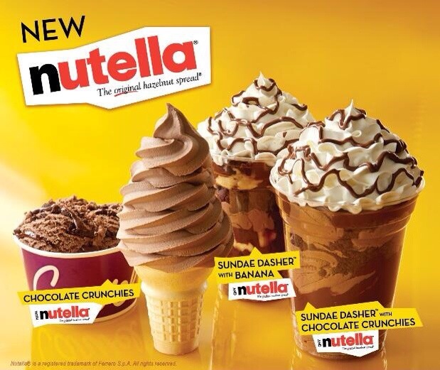 The flavors include a hand-scooped chocolate ice cream that’s layered with Nutella hazelnut spread, Carvel Crunchies and topped with more Nutella. A soft-serve ice cream made with Nutella spread. The Sundae Dasher with Banana (Nutella soft-serve and bananas topped with whipped cream and more Nutella). The Sundae Dasher with Chocolate Crunchies (Nutella soft-serve with banana and Carvel Crunchies).