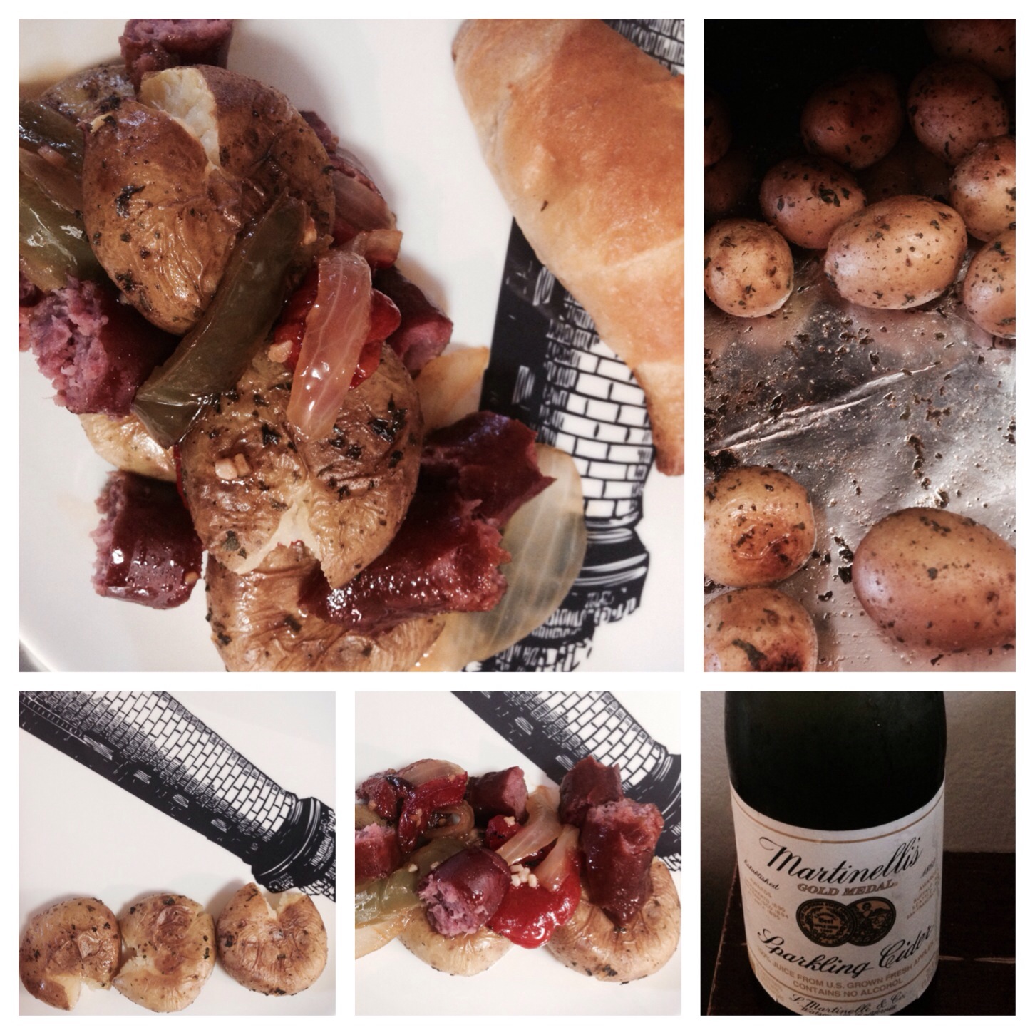 Once everything is done take your potatoes and smash them with your palm on a plate. They will be slightly open. Cut up your brats into bite size pieces and add your onions and peppers. I also added more smashed potatoes on top and made it like a sandwich.