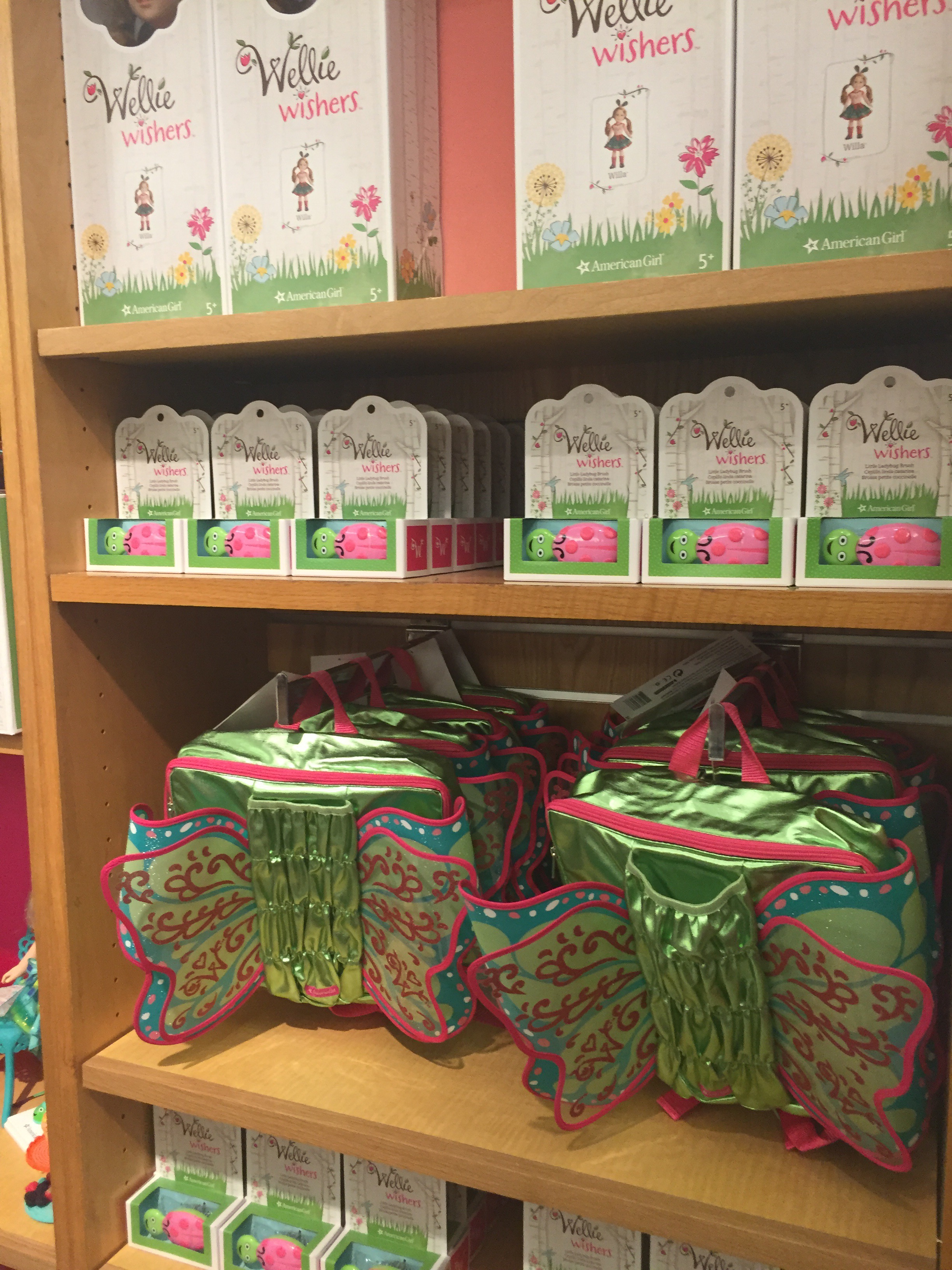 The dolls are 14.5″.They retail for $60. You can also purchase matching outfits for your daughter and her doll, wellies, socks, doll houses, etc. I purchased socks and a ladybug hairbrush for my daughter. The boots (wellies) don’t come in her size. If you order online there’s free shipping through 7/31. http://www.americangirl.com/shop/dolls/