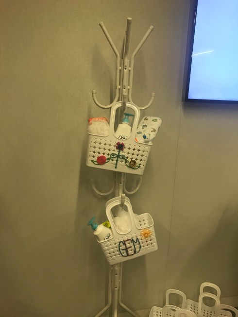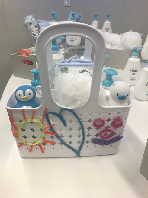 I made a baby caddy/bath tote at this station with Baby Dove Wash, baby toys, blankets and sponge. I decorated the outside of the caddy as well. Great creation to give as a gift. Click this link for more info:
