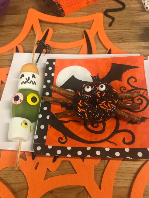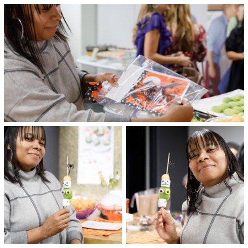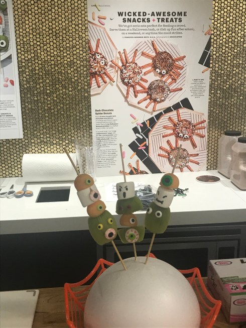 Station number four taught me how to make spooky snacks/treats courtesy of Parents and Parents Latina. I’ve always loved Parents Magazine so I was excited they were in attendance and even more excited to make these easy, fun snacks to take back home and show my kids how simple it is. I enjoyed making the Spider. I used a chocolate donut, pretzel sticks for the legs, sprinkles and stuck on eyes. The Monster Skewers was also fun to make. Just use skewers, marshmallows, cantaloupe, kiwi, put peanut butter so the eyes can stick to the marshmallow and an edible ink pen to draw the face.