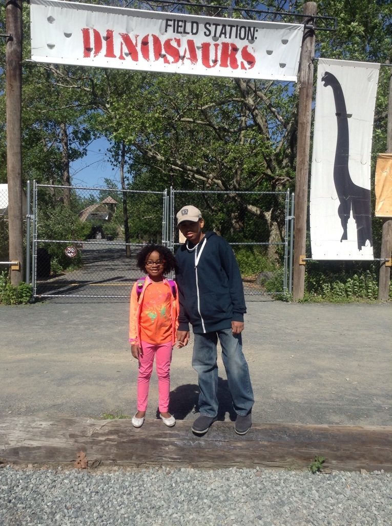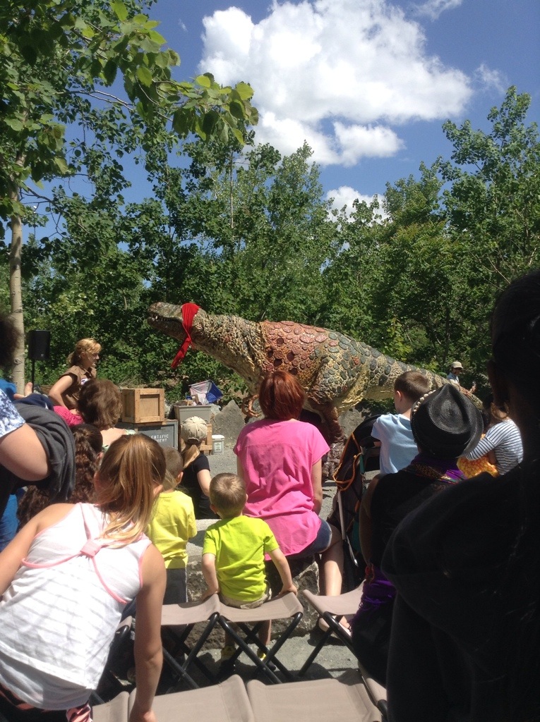 My kids and I hopped on the NJ Transit from Penn Station which took only 9 minutes and a 10 minute walk from train. The adult ticket was only $8 round-trip and kids 11 and under are free on weekends which is when we went. I was happy. We met up with Denise from Boyz Rule Our World. We took our kids exploring with these creatures along the 3/4 mile trail. There are workshops, games and activities for the kids along the trail. They also get to dig for prehistoric fossils and dinosaur skeletons at the Fossil Dig Site. T-Rex showed up at the “Dino Whodunit” presentation and I could hear screams from the front. It looked so real even with the person feet underneath. They played a game with the audience and T-Rex was blind folded.